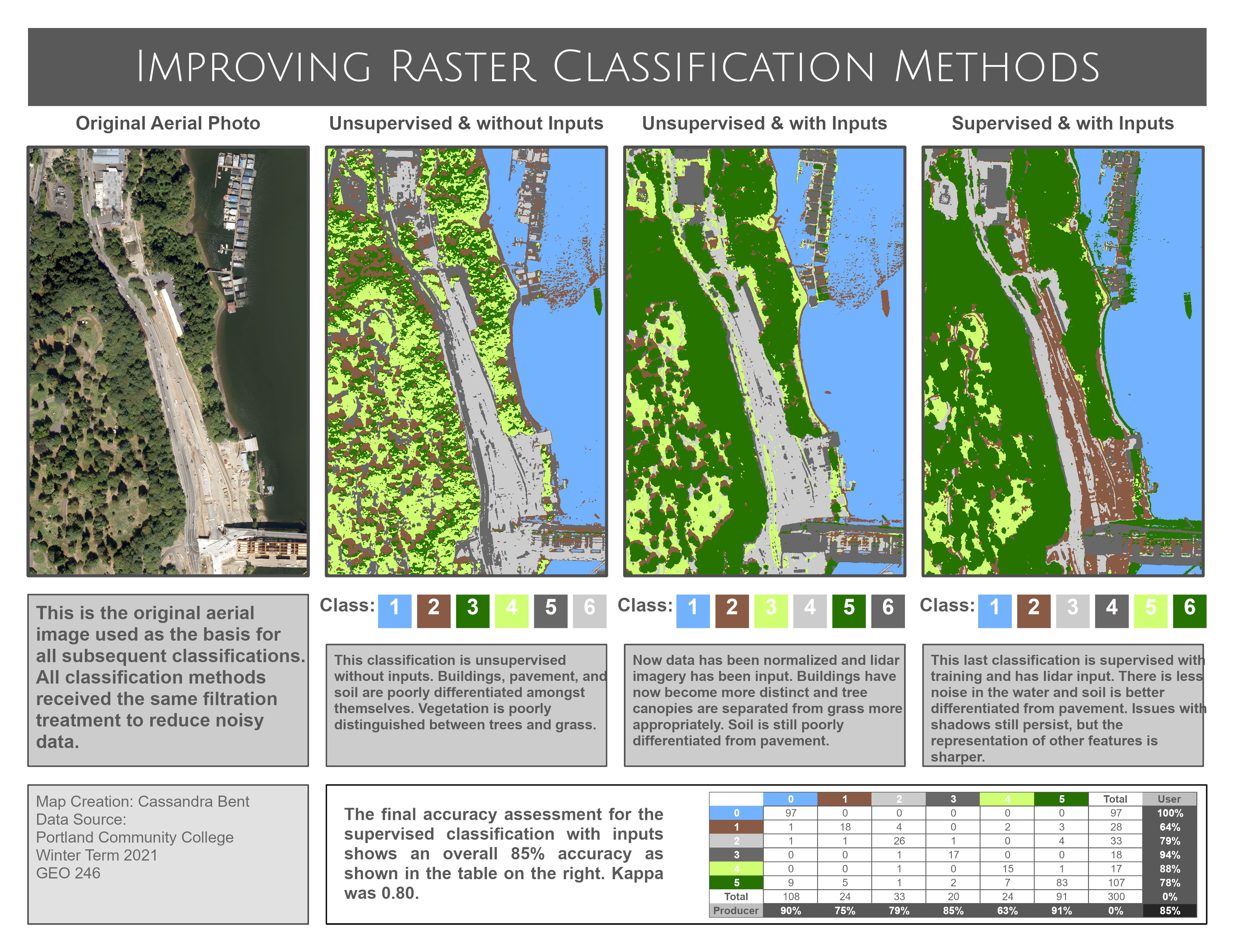 This project was part of a remote sensing tutorial with Portland Community College. The aim was to compare supervised versus unsupervised classification techniques to an aerial image. Through training, the supervised classification with LiDAR input shows the best accuracy for identifying classified objects in the image.