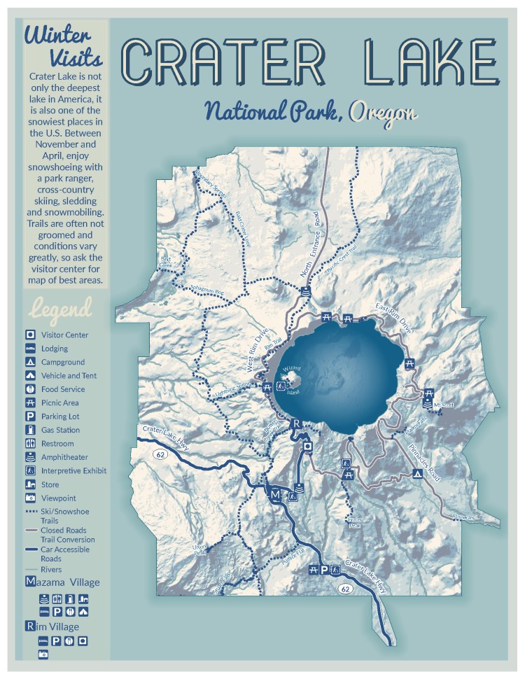 This map may highlight my finest cartography work. It is very different from anything I have done and takes a light hearted approach to mapping winter activities at Crater Lake. This map was created as part of the Cartography class at Portland Community College.