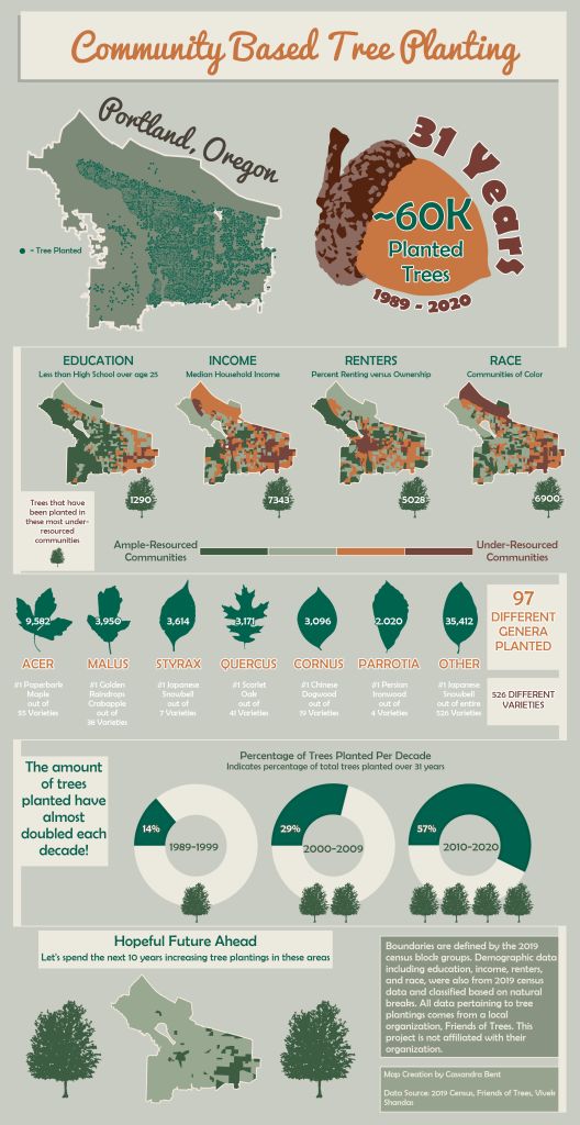 This infographic was created using planting data from Friends of Trees. Using excel, approximately 60k trees with varying common names were re-identified with the Genus. The above infographic was created using this file, illustrator, and ArcGIS Pro.