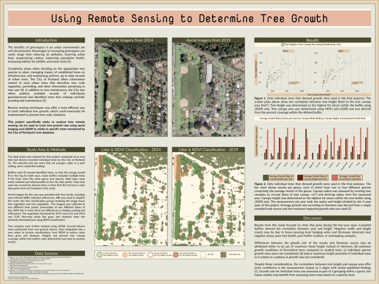 The above project integrates NDVI and LiDAR to attempt to assess tree growth between 2014 to 2019. This is a final project that was part of the requirements for the remote sensing course with Portland Community College.