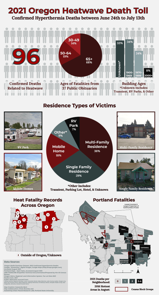 There is a publicly available list of Oregon residents that died during the 2021 heat wave. Using their addresses, names and dates of death, information regarding their building type and age could be determined. This infographic was created as part of a project with the SUPR lab based at Portland State University. The above images and maps were created with Google Earth, ArcGIS Pro, and Illustrator.