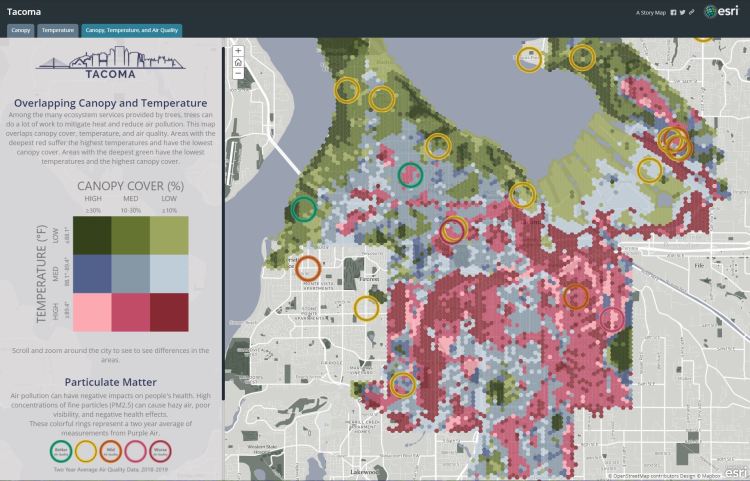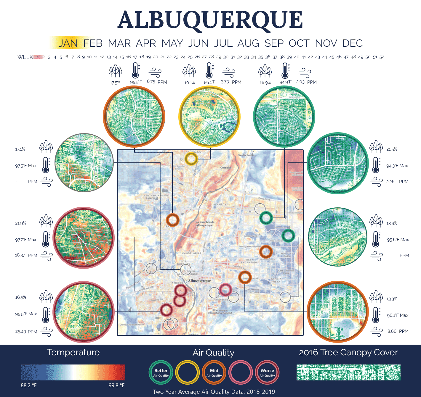 This interactive map was created as part of the Canopy Continuum Project led by the SUPR lab based at Portland State University. This map incorporates temperature, air, and canopy cover. This map style was created for Albuquerque, Portland, Boise, Tacoma, and Sacramento. This map was created using ArcGIS Online.